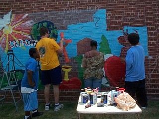 we went in, and saw a travisty. A major work project with meat on the counter and in pans, all over the place like someone had cleaned an animal, grease splattered all over the kitchen's big picture window, chocolate for molds eaten, serving pans sitting stinking of rotten food, that was never cleaned, then, we noticed also that the dodgeballs were stolen, the floor was all sticky, because of some kind of punch, the craft closet was broken into and the puff paints were used. Shannon was steaming out her ears. litterally. her eyes were bugging out, and I thought she was going to choke me, because she had that look because she was so mad at those other churches, and it took 3 hours for us to clean up enough to have people come in at eleven. So, who should call but Helen our Host family parent, and she called and said, Jacob, since you had such a rough driving day, should I come down and help out? I said "sure, the more the marryier." Then Low and behold we met Miranda who is from port huron, and she is a nice girl, she came into our presence because john atkinson asked her when she was staff at senior high to come down and take john corn and jordan, and linda's place for a week. Kim could not get off of work on monday, but she did come tuesday, wednesday, thursday. Anyway, Miranda helped cut some sheets, and we had the bright idea of making pillows all week. the kids would not have the attention span, and could not take all of the small motor skills to tie the pieces together just using square knots, or overhand knots. Also the kids and I started a mural of Jesus on the wall next to the mural that I have been completing, with details steadily. Also on this day, tim, teara, katrina, britney, areien, and dave, all painted hop scotch, 4 square, and tick tac toe on the pavement for fun games in the church's back alley.This was fun, but this was the hottest week of the summer up here at just around 90 all week with a humidity at around 80% making it feel hotter than that. That day, after seeing my partner go crazy, because of the mess, that was diverted with a little elbow grease, I felt like johnny c needed a call. I told him that I had been concerned that we may be spending undue amounts of time on the cleaning up on monday, and that the other churchs should get a talking to, so I asked if we could consult john atkinson and jerry, about it, and give him our testimony of how it almost looked vandalized. At this juncture, I wish shannon would have taken some deep breaths, because she was trying to get me to tell johnny c a whole smattering of things, in that short little phone call. I said, hold on, and continued. I think that he appreciated that I never got emotional about it, and simply stated that it was a problem, and needed to be resolved with john and jerry, I think if I had fed all of that information to him that shannon was feeding me, his patience and caring nature on the phone would have been diminished.